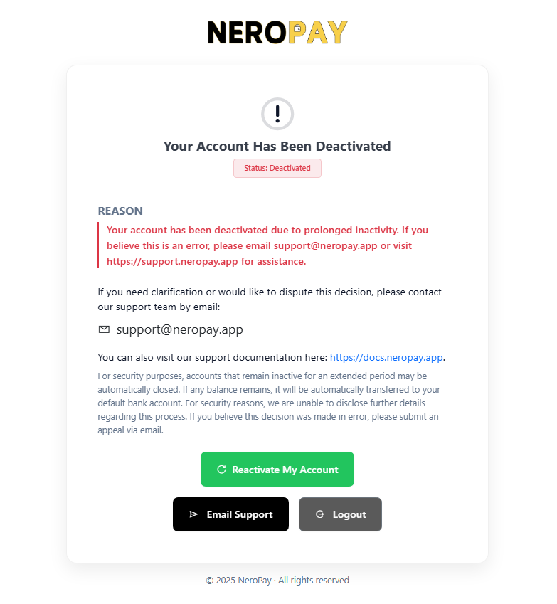 If you experience any issues during the reactivation process, please get in touch with our support team at support@neropay.app
