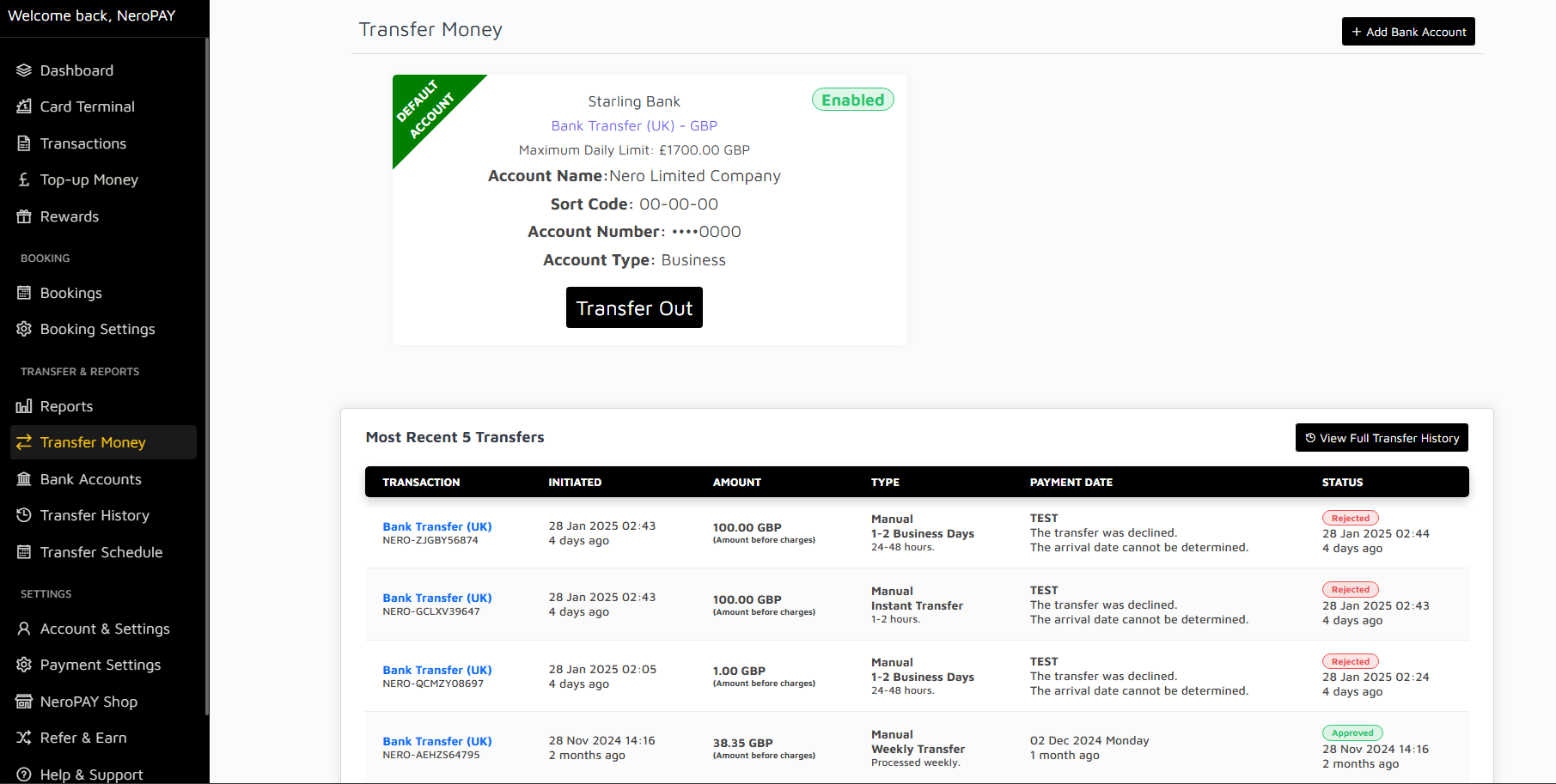 The Transfer Money section allows you to move funds from your NeroPAY account to your linked bank account. This feature is designed to ensure secure, quick, and seamless transfers, making it easy to access your funds when needed.