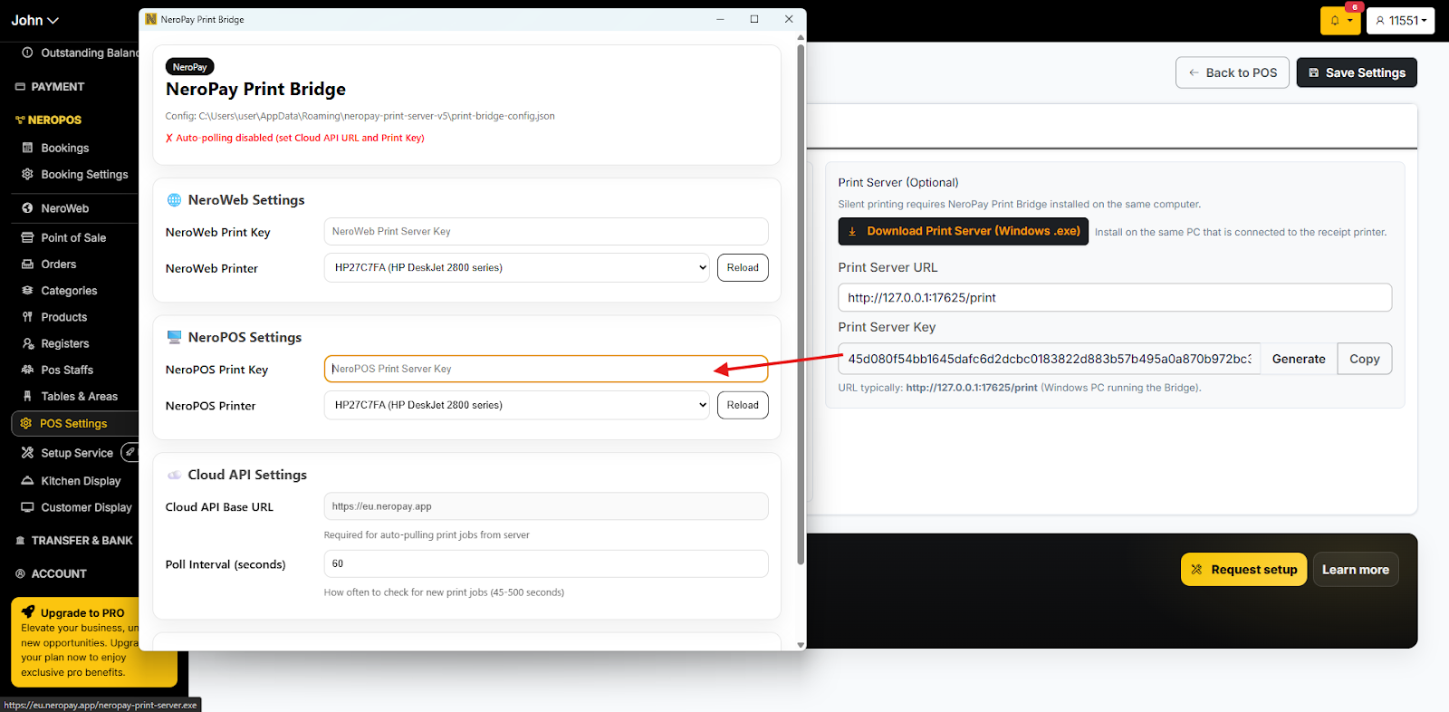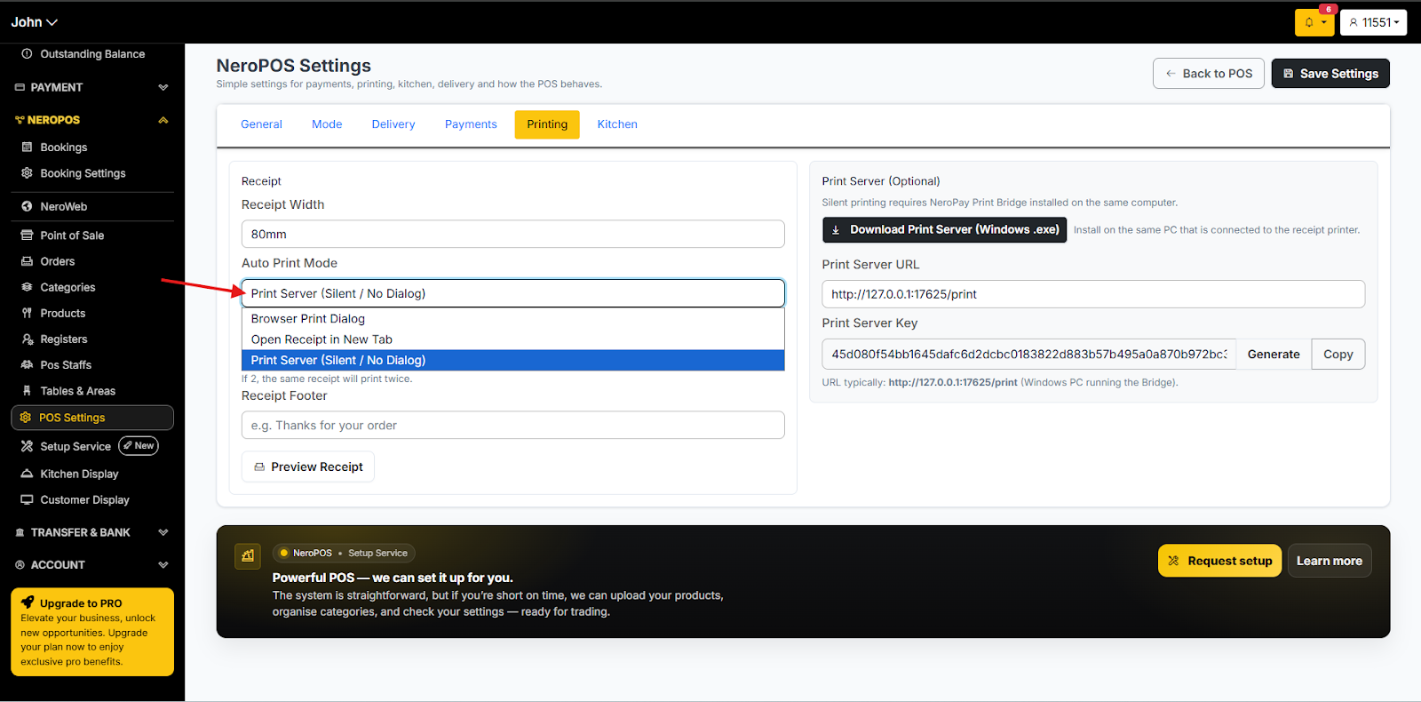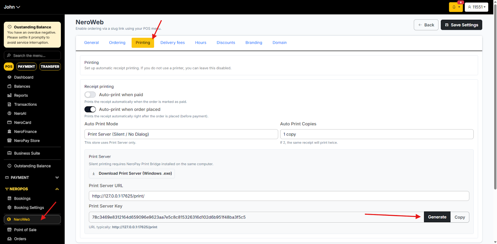To automate printing for all orders (including online orders from NeroWeb), you must configure the NeroEPOS Print Server. This acts as the bridge between your cloud dashboard and your physical printer.