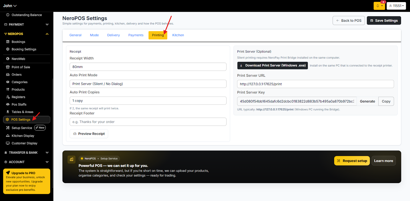 1. Go to “NEROPOS -> Pos Setting”. Click on the Printing Tab