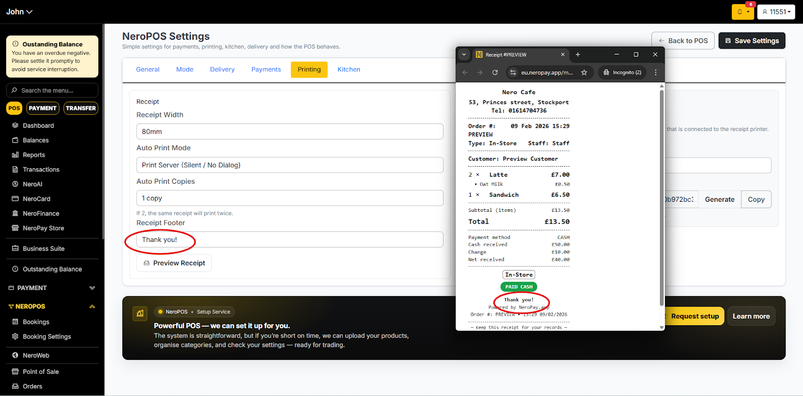 2. If you would like to add any footers to your receipt, you could change them here. NeroPOS Settings -> Printing Tab