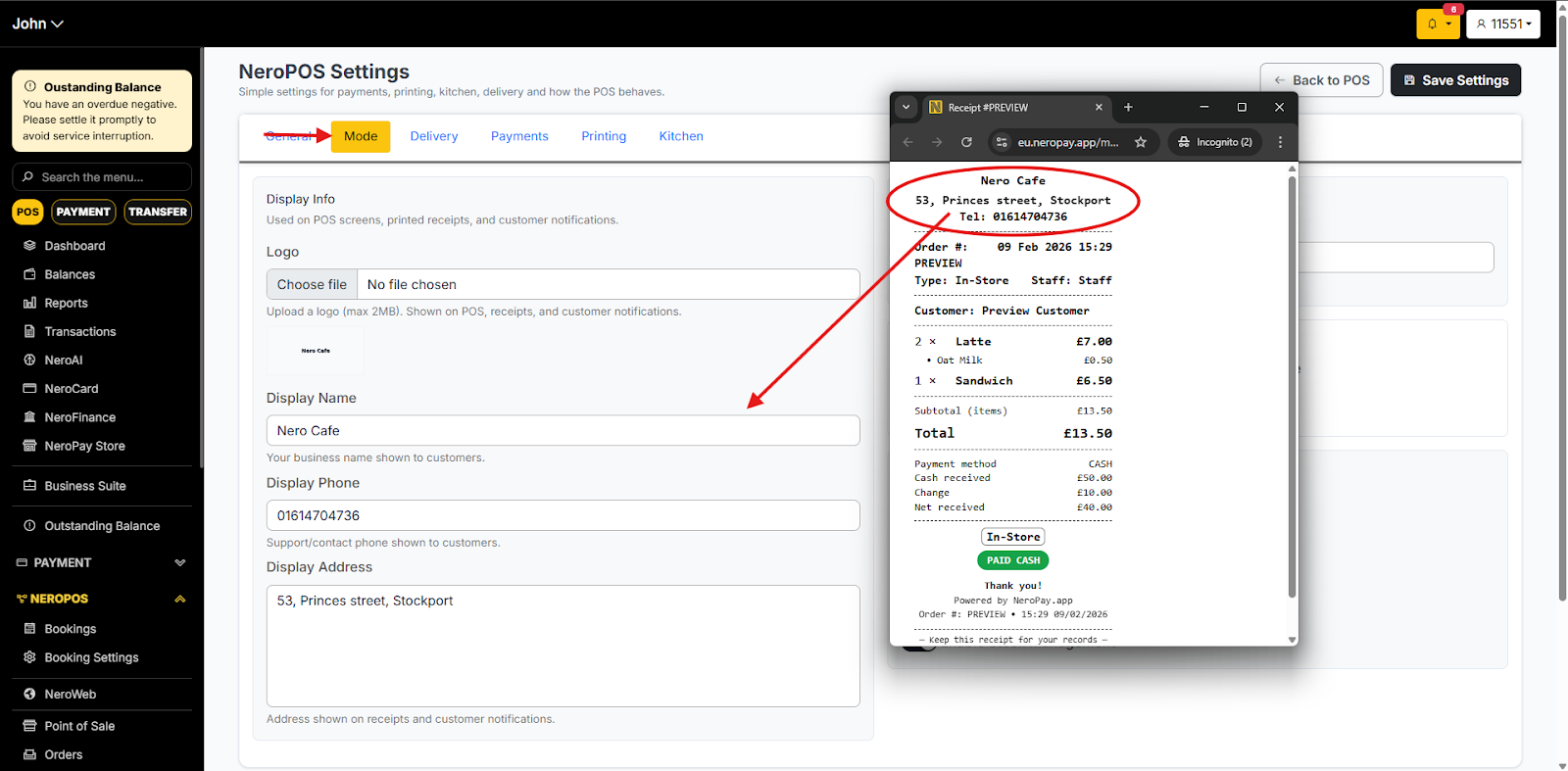 3. If you would like to change the name of the shop, phone number or address, you could edit it from NeroPOS Settings -> Mode