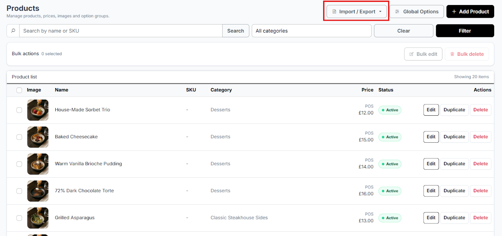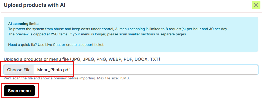Use AI to add your entire menu in one go. Simply upload an image or PDF of your menu, and the system will take care of the rest.