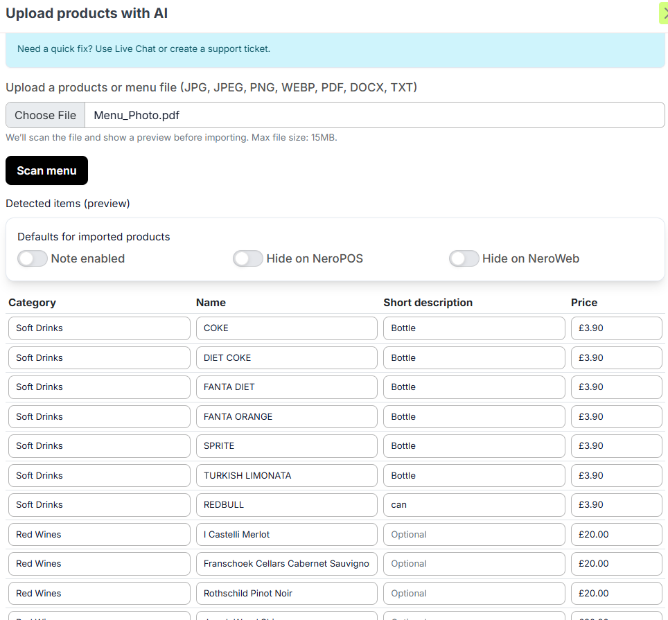 Manually entering a menu can be time-consuming. Use NeroAI to scan a photo or PDF of your physical menu and automatically populate your POS and online store.