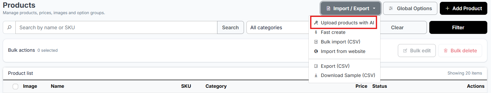 - Open AI Tool: Click the “Import/Export” button at the top right, then select “Upload Products with AI” from the dropdown menu.