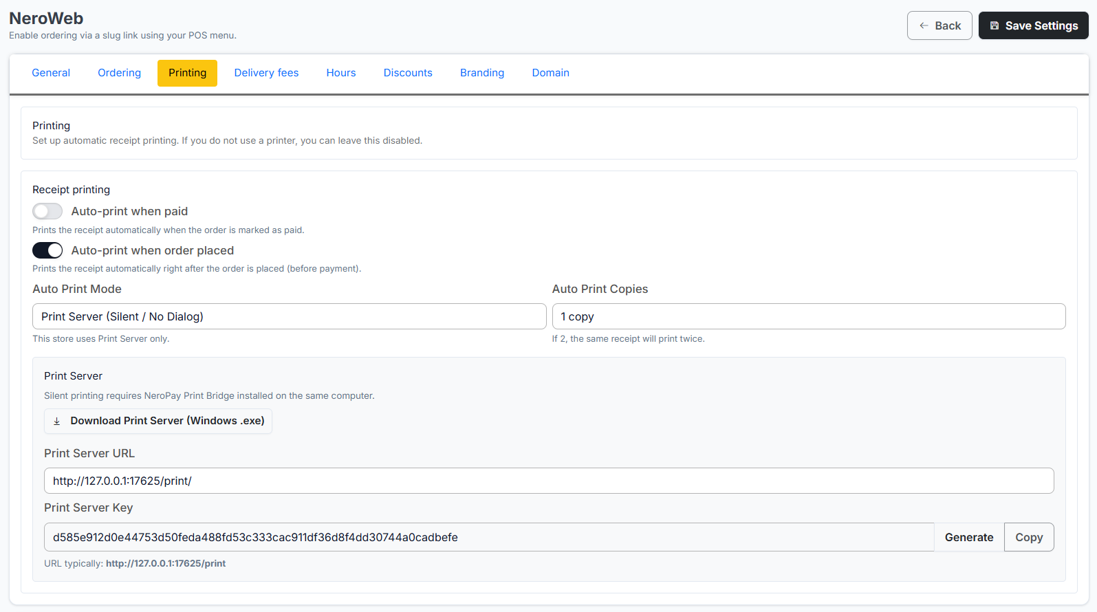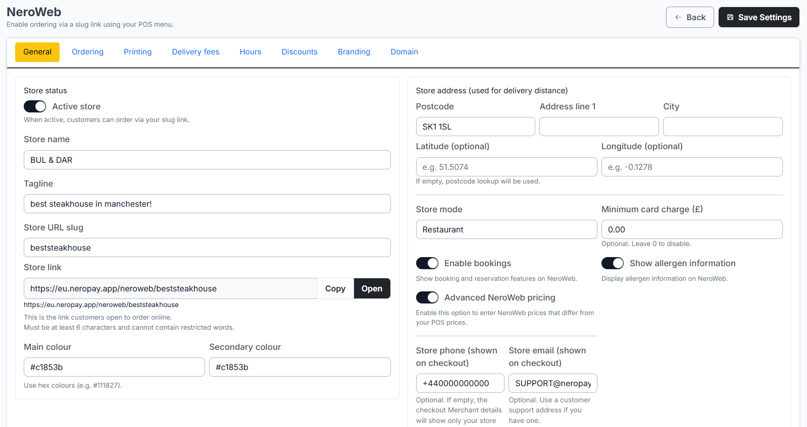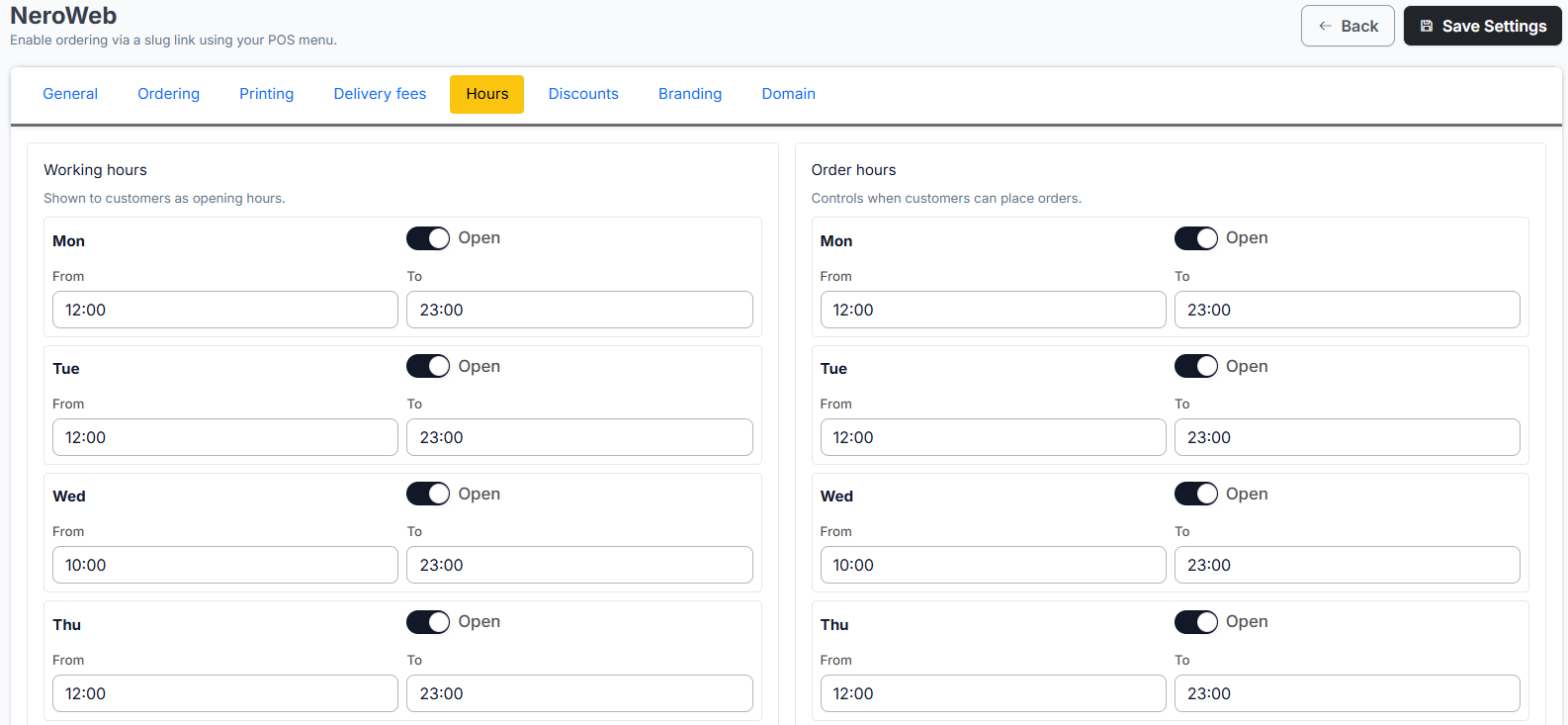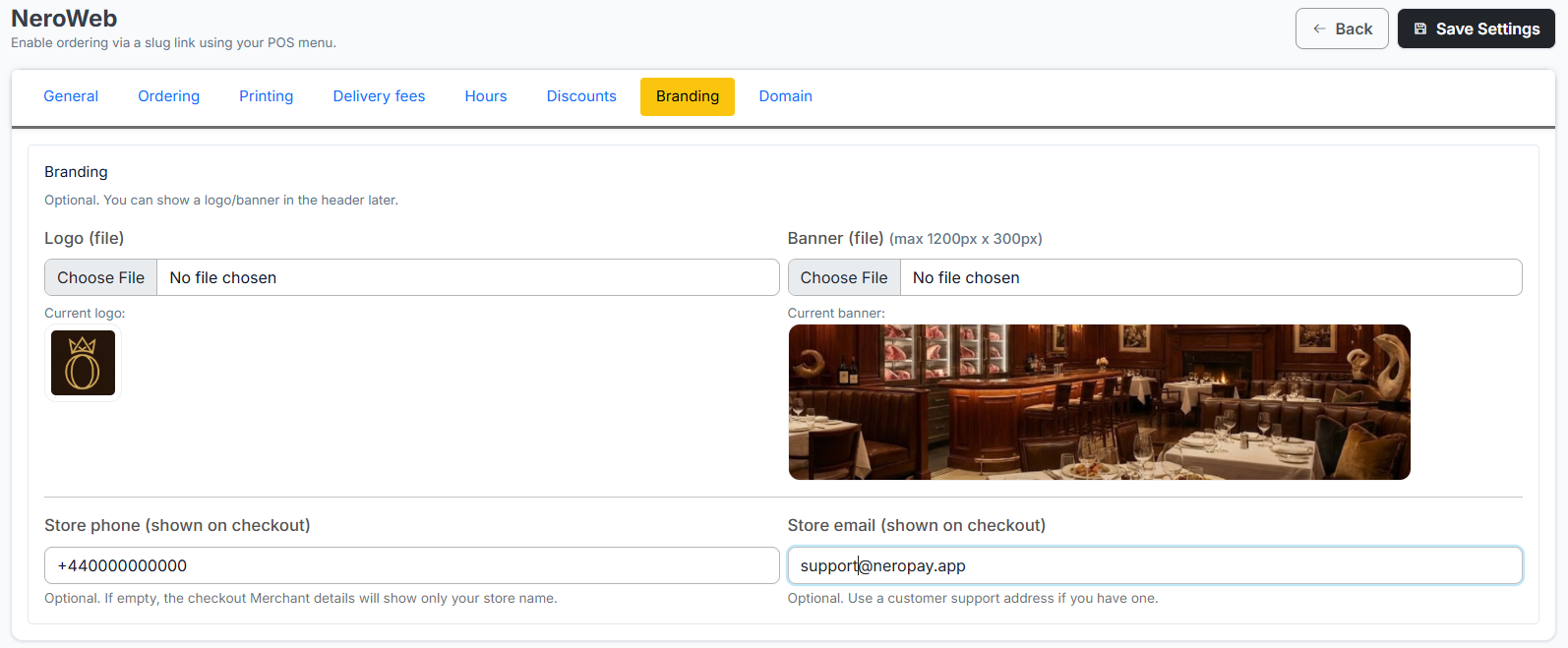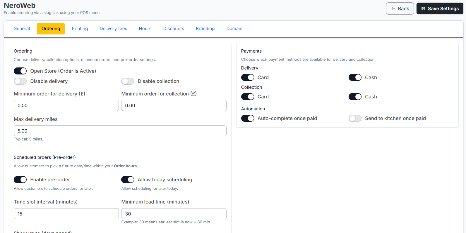 This guide will walk you through setting up and managing your NeroWeb online ordering platform via the NeroPay dashboard.