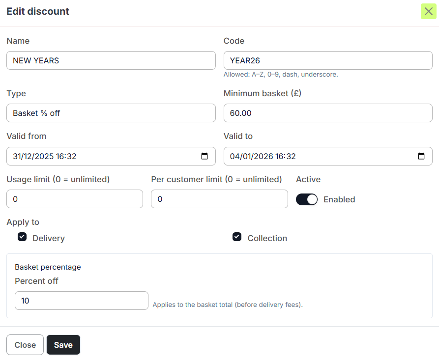 Restrict codes to specific order types (Delivery or Collection).