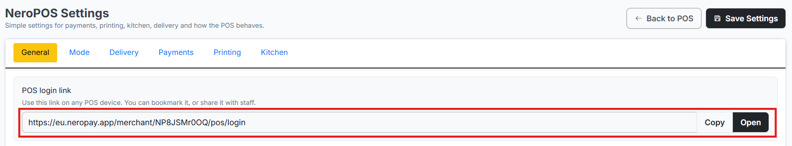 - Find the Link: At the top of the General page, locate the field labelled “POS Login Link.”