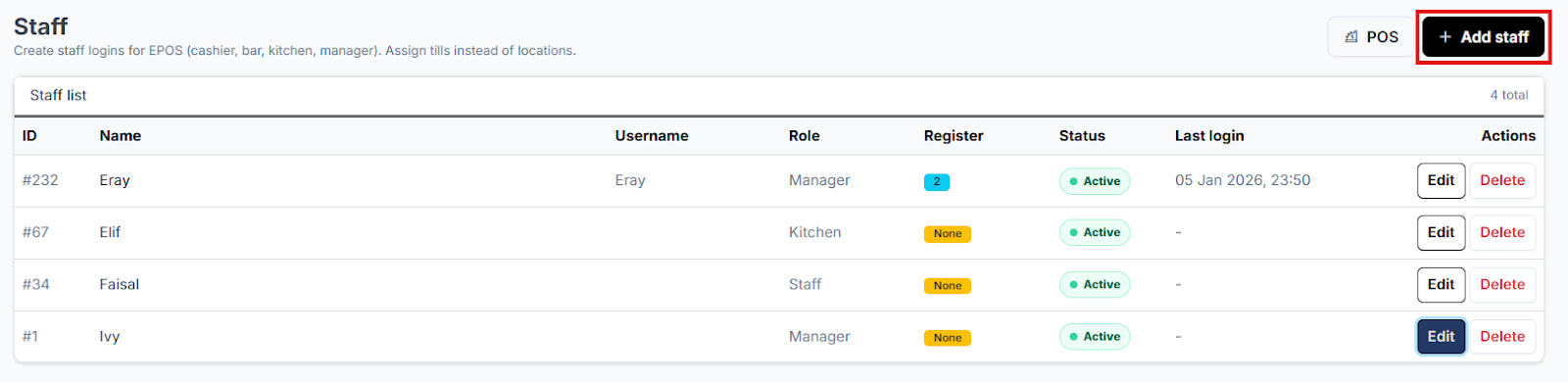 Staff logins will only have access to the EPOS order-taking functions.
