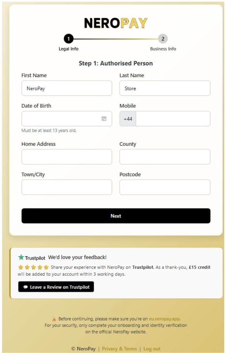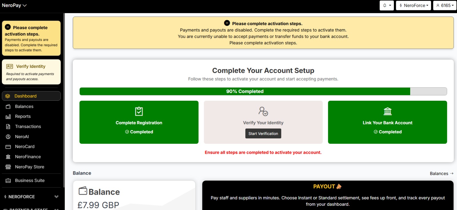 After registration, the merchant is redirected to the Dashboard, where they will see their activation progress.