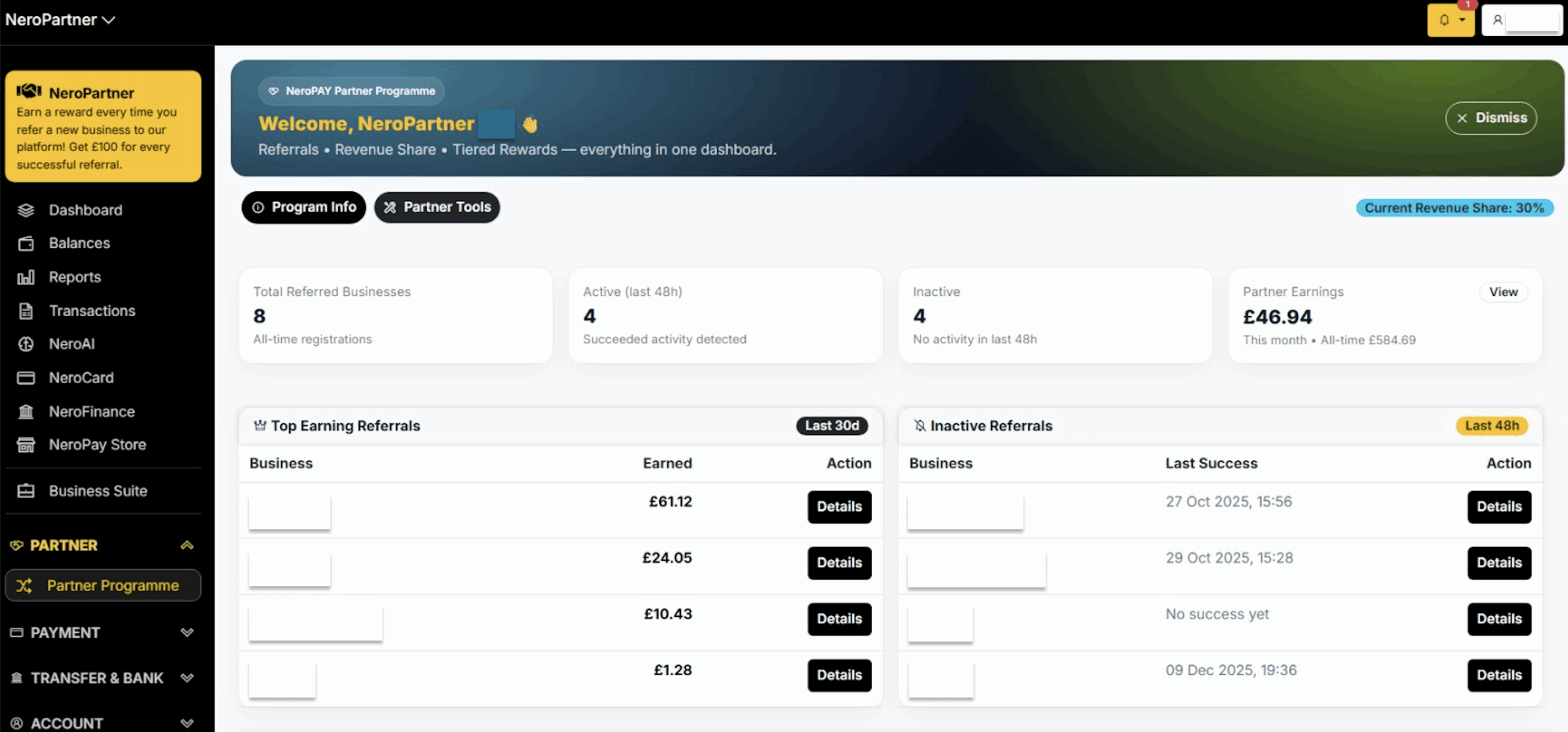 The dashboard highlights inactive referrals to help partners identify merchants who may need support.