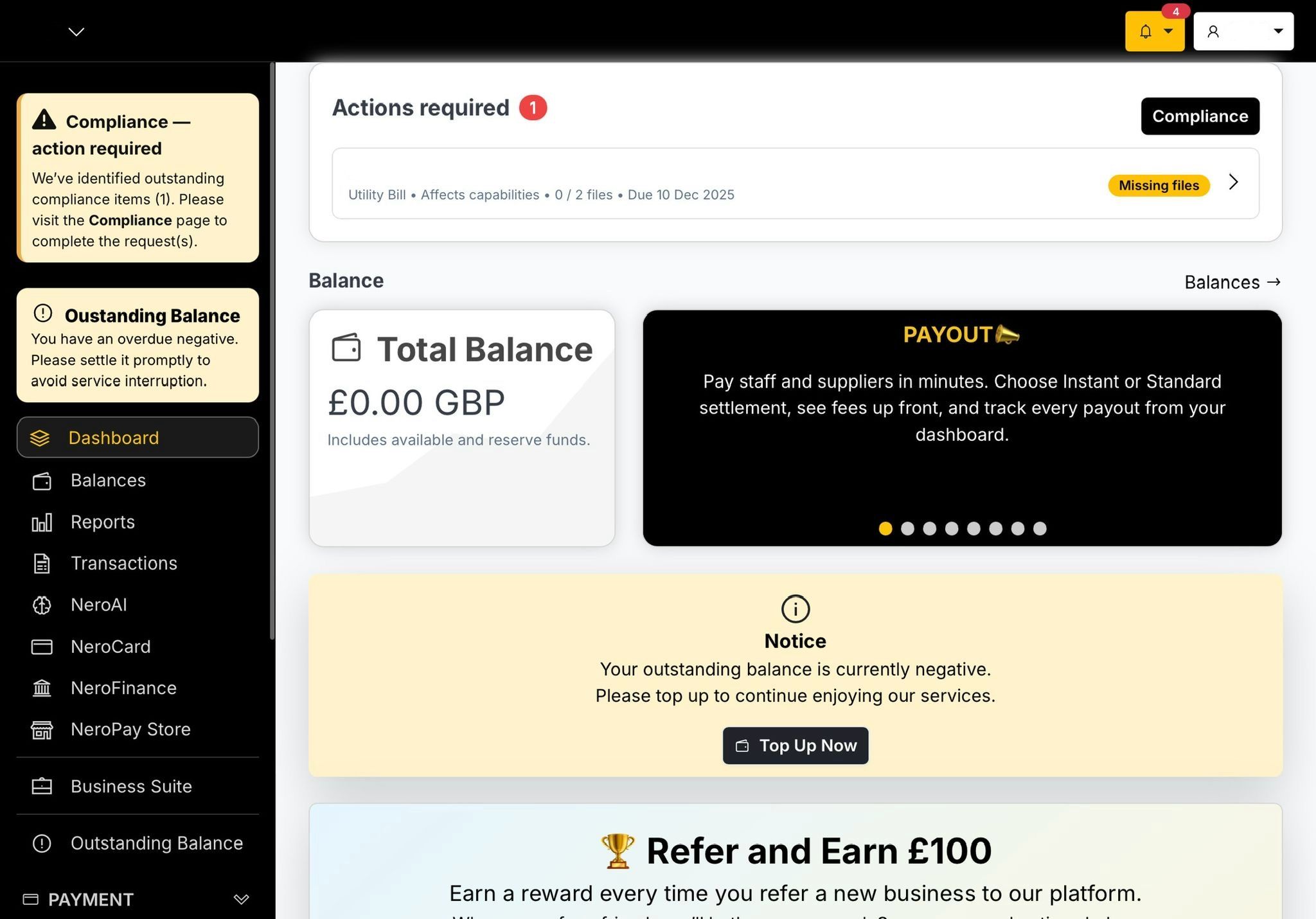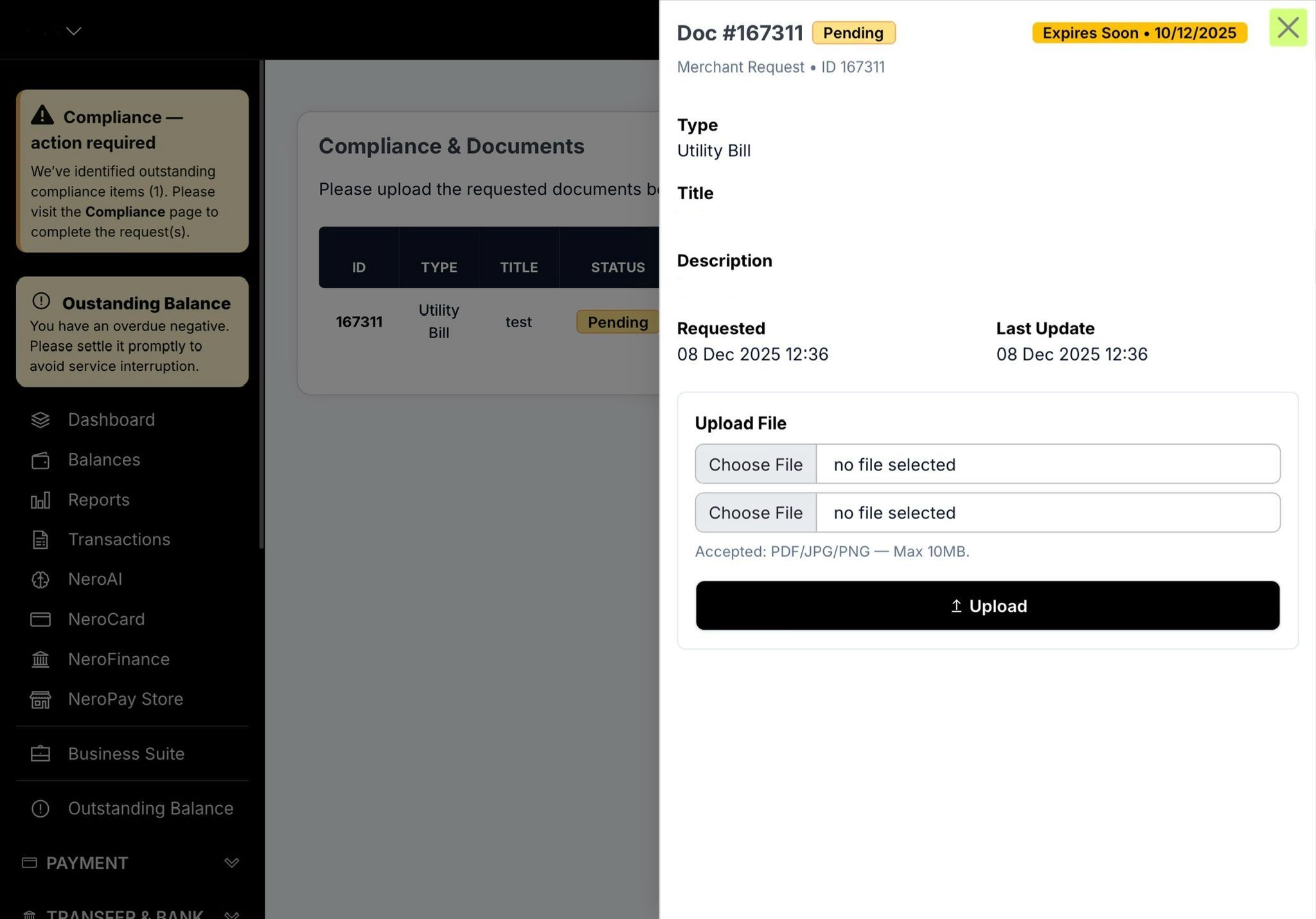 This will take you to the Compliance page, where you can see the specific items we have requested (e.g. “Utility Bill”, “Bank Statement”, “Environment Video”).