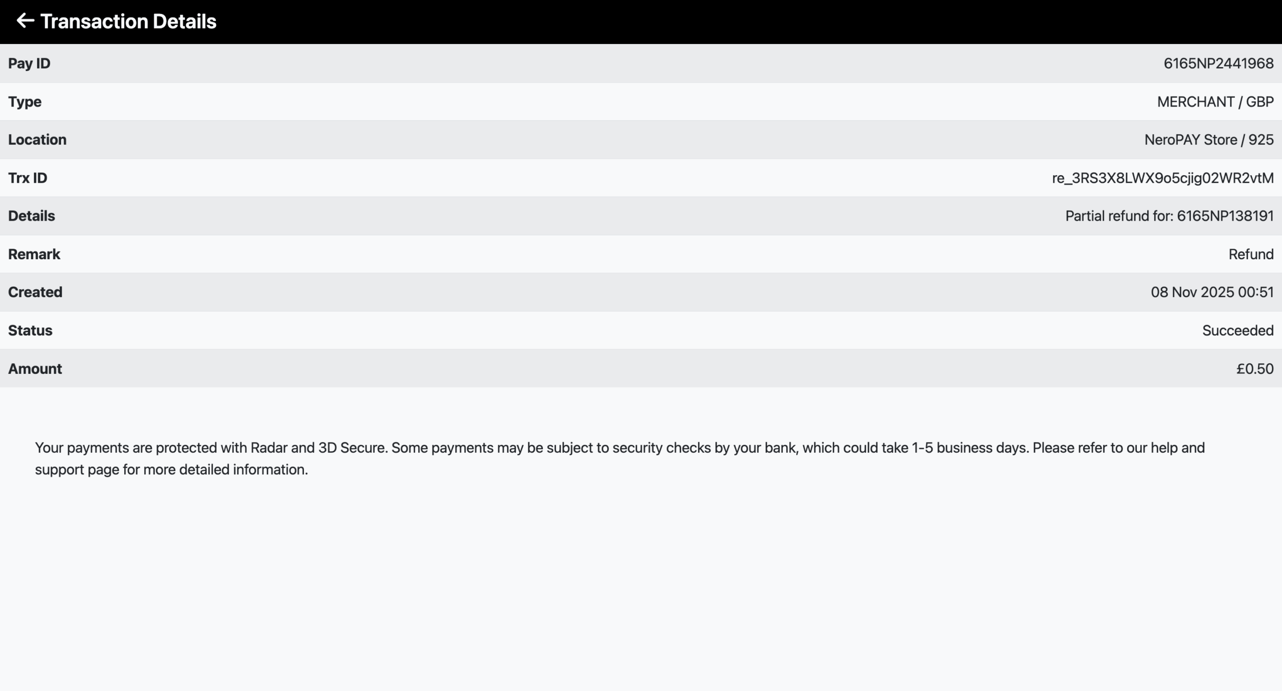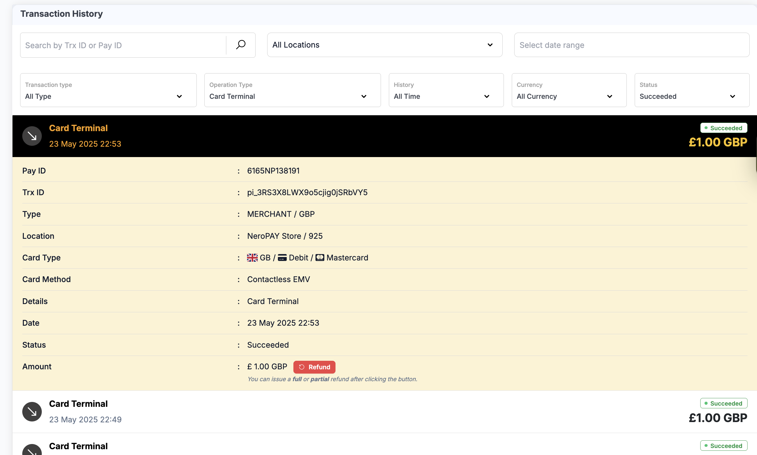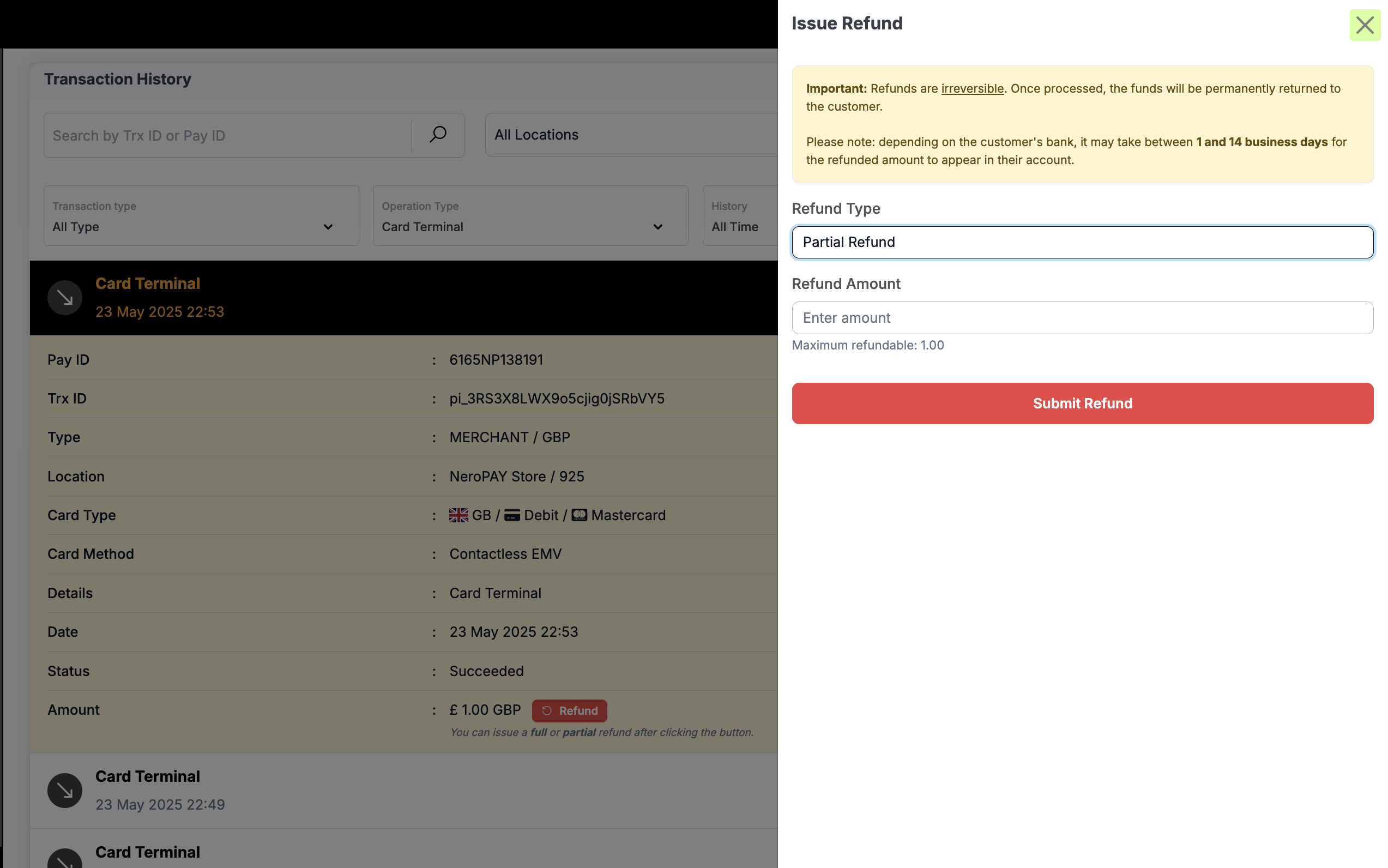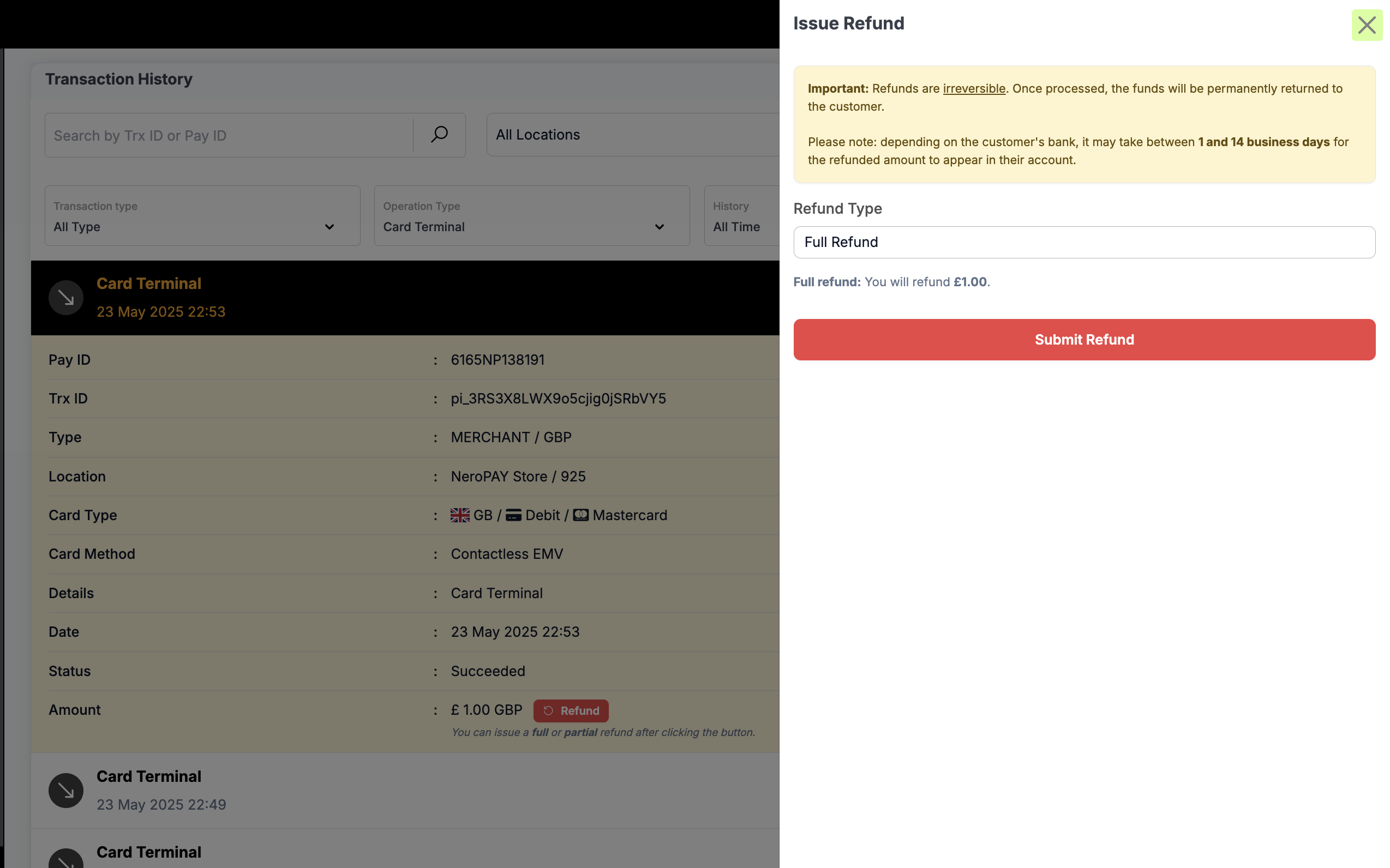 Merchants can process both full and partial refunds directly through the NeroPay Dashboard.
